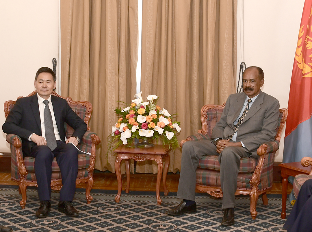 Asmara (Dawan)- Madaxweynaha Eritrea, Isaias Afwerki ayaa maanta oo Axad ah ku qaabilay Aqalka martida ee Denden Danjire Xue Bing oo ah ergeyga gaarka ah ee Shiinaha u qaabilsan Geeska Afrika.
