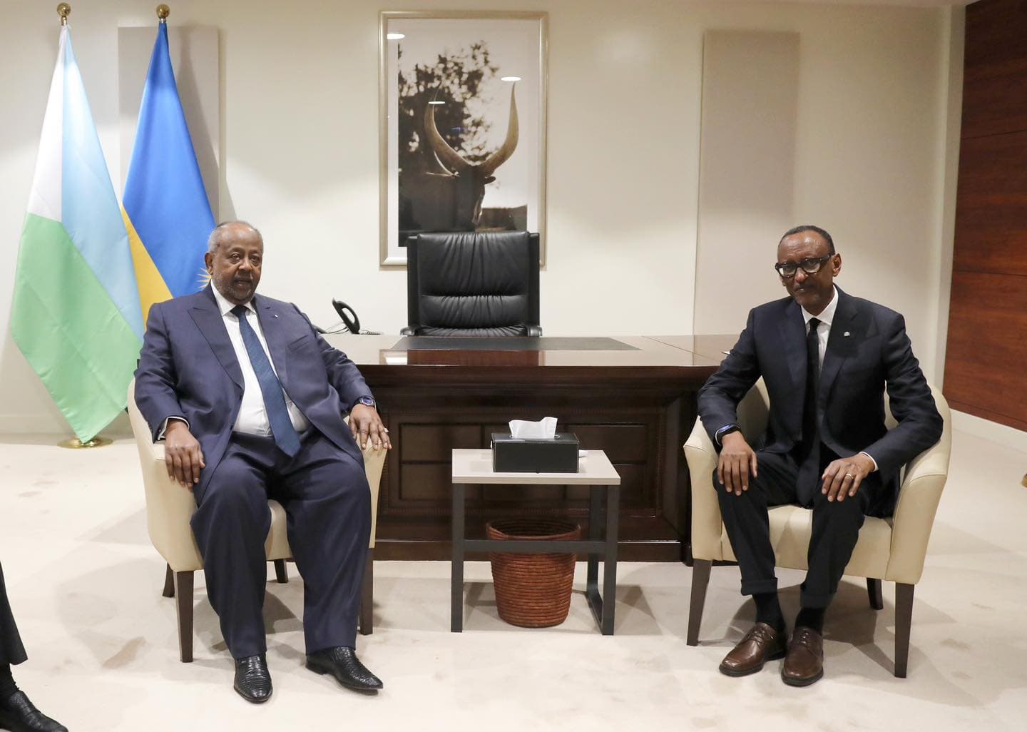Dhinaca kale, Madaxweyne Geelle ayaa la kulmay dhiggiisa Rwanda, Paul Kagamé, waxeyna isla soo qaadeen xiriirka mudnaanta leh iyo iskaashiga istiraatiijiyadeed ee u dhexeeya Jabuuti iyo Rwanda.