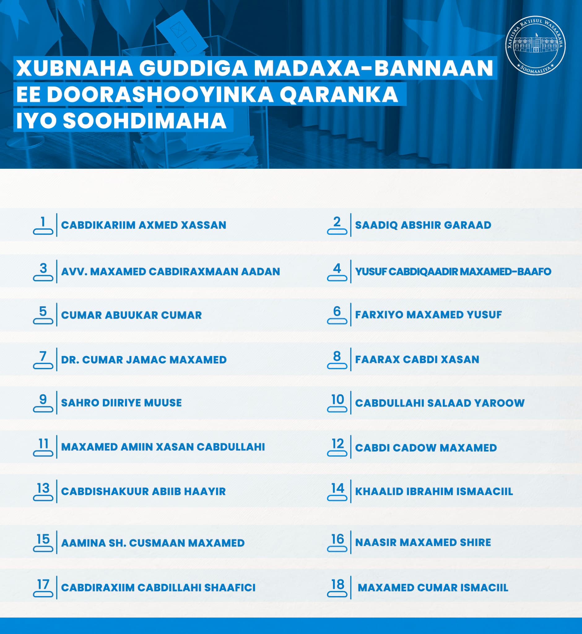 Muqdisho (Dawan)- Baarlamaanka Soomaaliya ayaa ansixiyay xubnaha Guddiga Madaxa Bannaan ee Doorashooyinka Qaranka iyo Soohdimaha, xilli uu jiray buuq iyo dood ka dhex taagneyd xubnaha golaha. Guddoomiyaha Golaha Shacabka, Aadan Maxamed Nuur (Aadan Madoobe), ayaa ku dhawaaqay ansixinta xubnaha guddiga, taasoo noqotay tallaabo ay xukuumaddu u aragto muhiim oo loo qaaday hirgelinta doorashooyinka qof iyo cod ah.