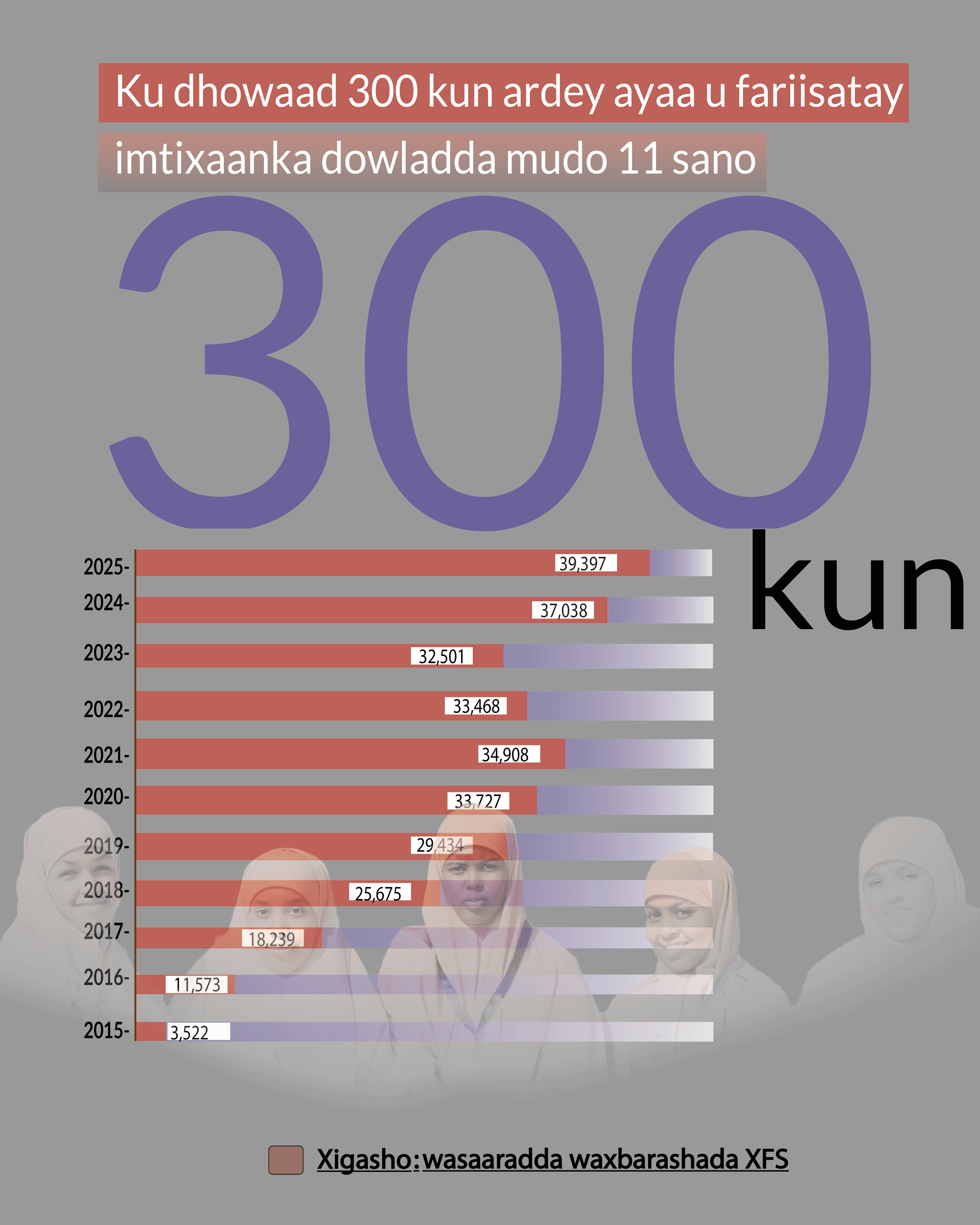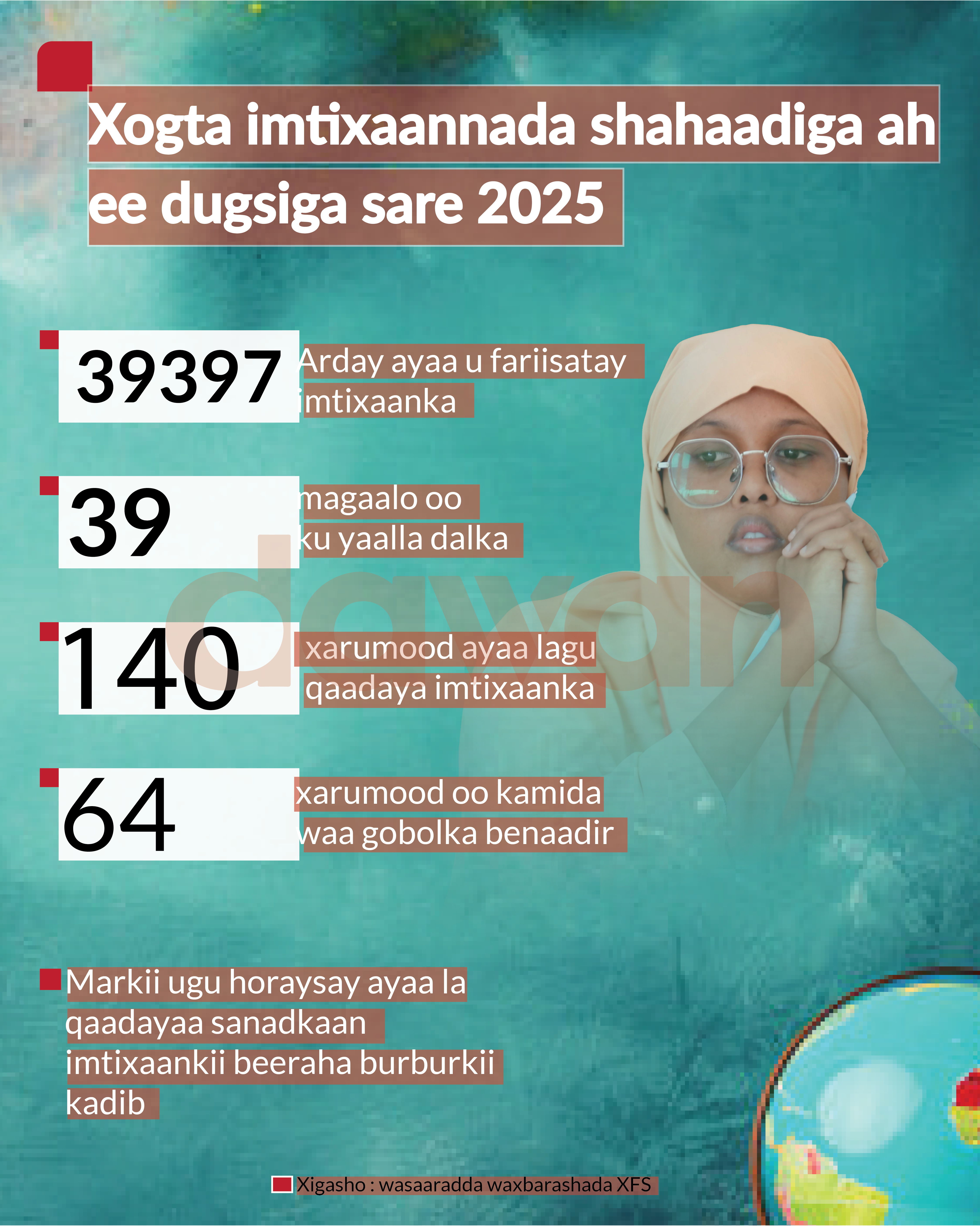 Muqdisho, Soomaaliya - Maanta waxaa si rasmi ah gobollada Koonfurta, Bartamaha, iyo deegaannada SSC-Khaatumo uga furmay imtixaanka shahaadiga ah ee fasalka 12aad ee dugsiyada sare Soomaaliya kaas oo ay u fariisteen in ka badan 39,000 oo arday oo ka kala yimid 39 magaalo oo dalka ah.