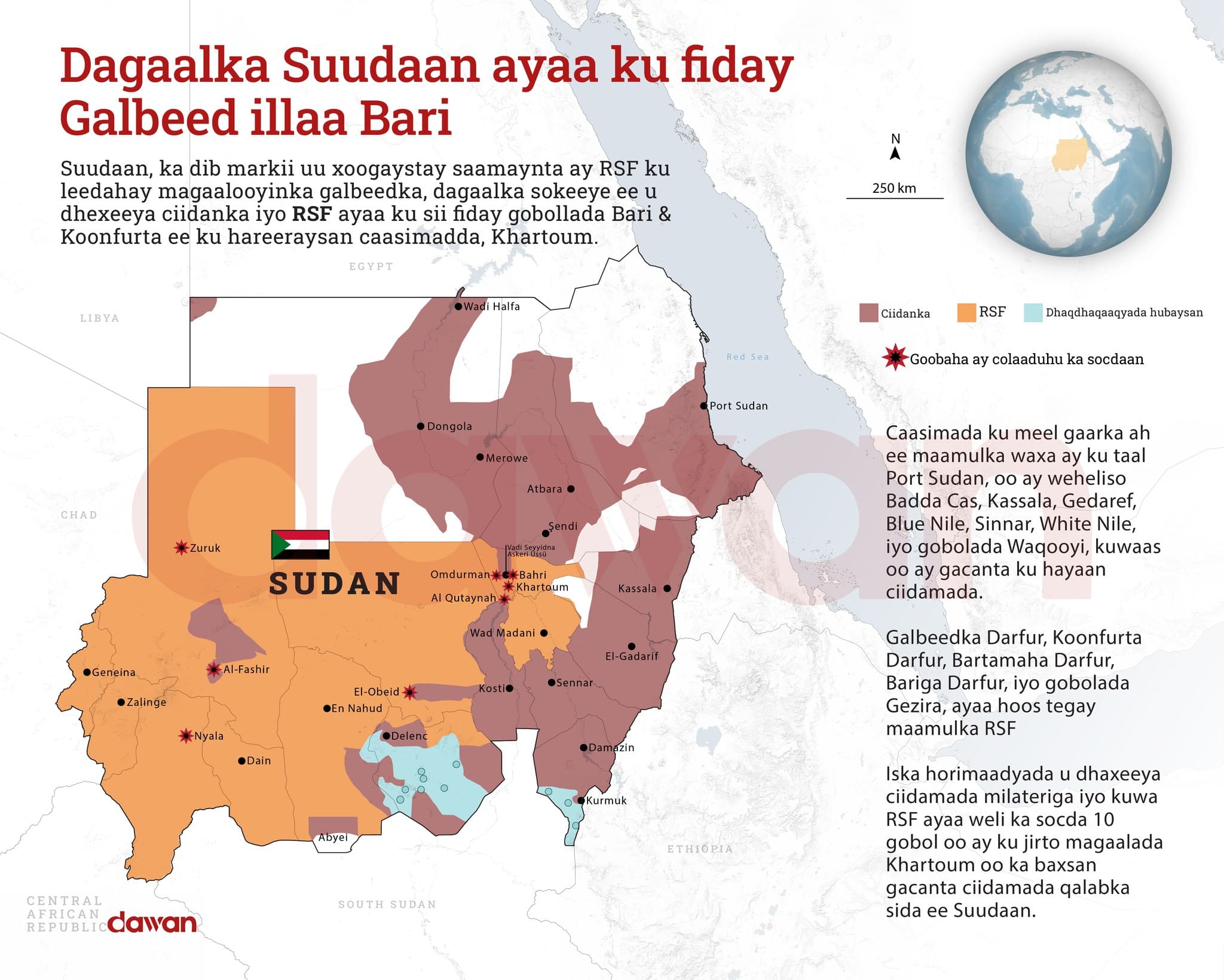 Khartoum (Dawab)- Dagaalka Suudaan ee u dhaxeeya Ciidamada dalkaas iyo xoogaga kasoo horjeeda RSF ayaa ku fiday Gobollo cusub gaar ahaan Galbeedka iyo Bariga.