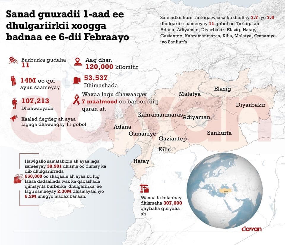 Ankara (Dawan)- Waaberigii 6-dii February, 2023, dhul-gariir aad u xoogan oo cabbirkiisu gaarayay 7.7 ayaa ku dhuftay Koonfurta Turkiga iyo Waqooyiga Suuriya, saacado kaddibna waxaa xigay mid kale oo cabbirkiisu ahaa 7.6, iyo kuwa kale oo geystay khasaara aad u badan oo isagu jirtay dhimasho, dhaawac iyo burburka dhismooyin fara babadan.