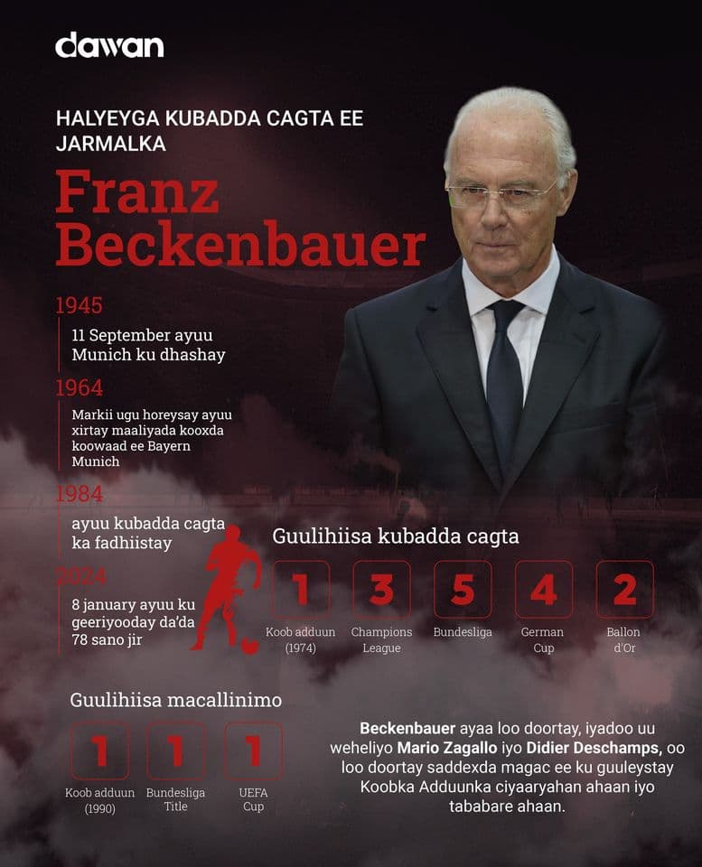 Beckenbauer oo ku geeriyooday da'da 78-aad ayaa dalka Jarmalka kula guuleystay Koobkii Adduunka 1974 isaga oo ciyaariyahan ah iyo 1990 isaga oo Tababare ah.