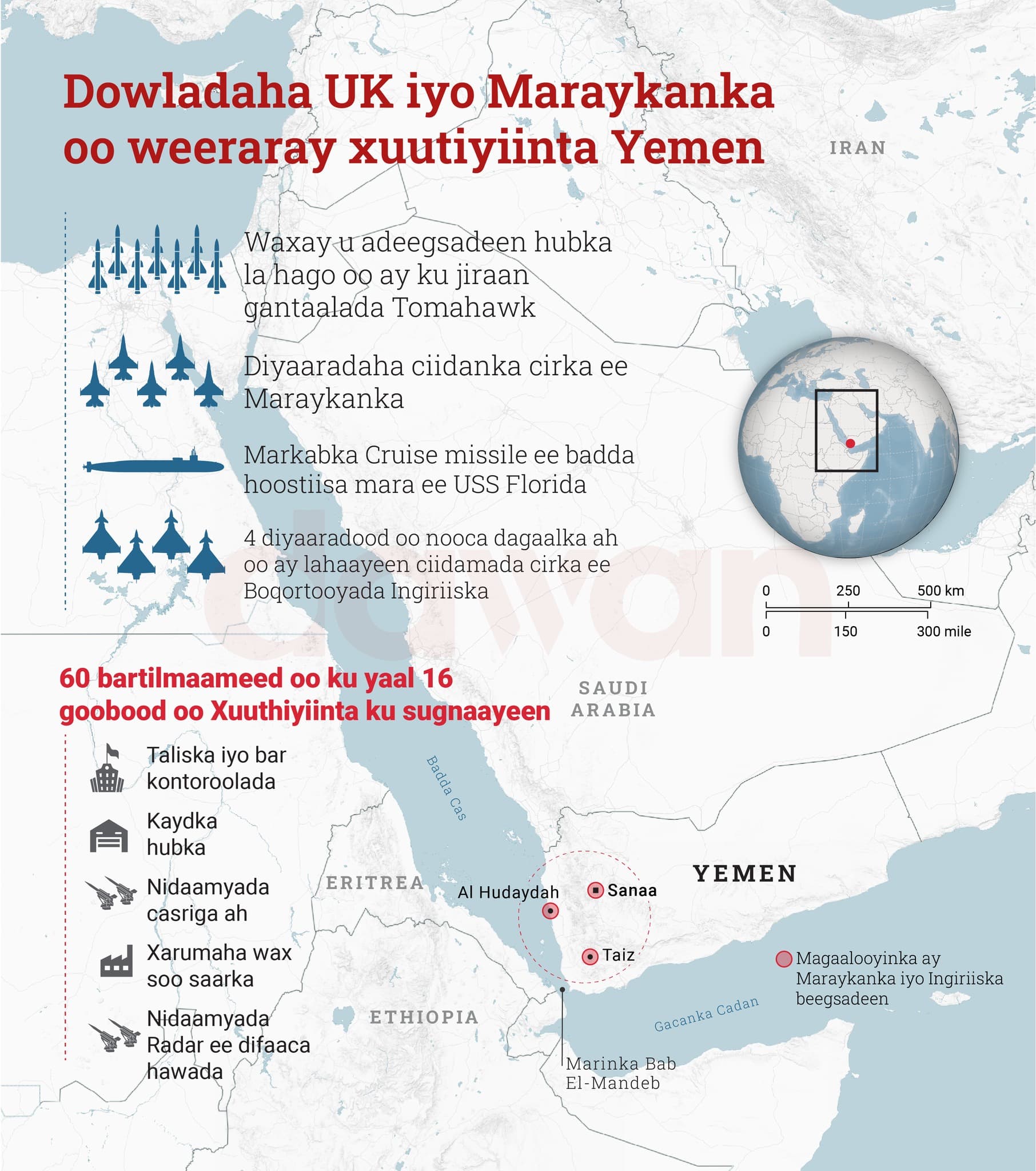 Sanca (Dawan)- Aqalka Cad ee Mareykanka looga taliyo ayaa ku dhawaaqay barqonimadii Jimcihii, in 10 dal uu hoggaaminayo Mareykanka in ay weerar cirka ah ku qaadeen saldhigyo ay leedahay Kooxda Xuutiyiinya ee Yemen, iyada oo laga jawaabayo weerarada ay ku qaaday Maraakiibta xiriirka la leh Isarel ee mara Badda Cas.
