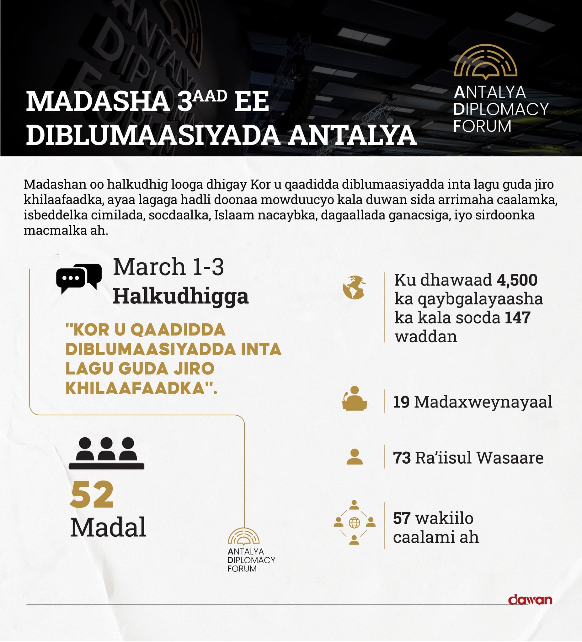 Antalya (Dawan)- Madaxweynaha Turkiga, Recep Tayyip Erdoğan ayaa jimcihii daah furay shirki saddexaad ee Madasha Diblomaasiyadeed ee Antalya, iyadoo halku-dhig looga dhigay ” Kor u qaadidda Diblomaasiyadda, xilliyada xasaradaha”, waxaana goob joog ahaa wakiilo ay ku jiraan Madax ka kala socotay dalal kor u dhaafay 100.