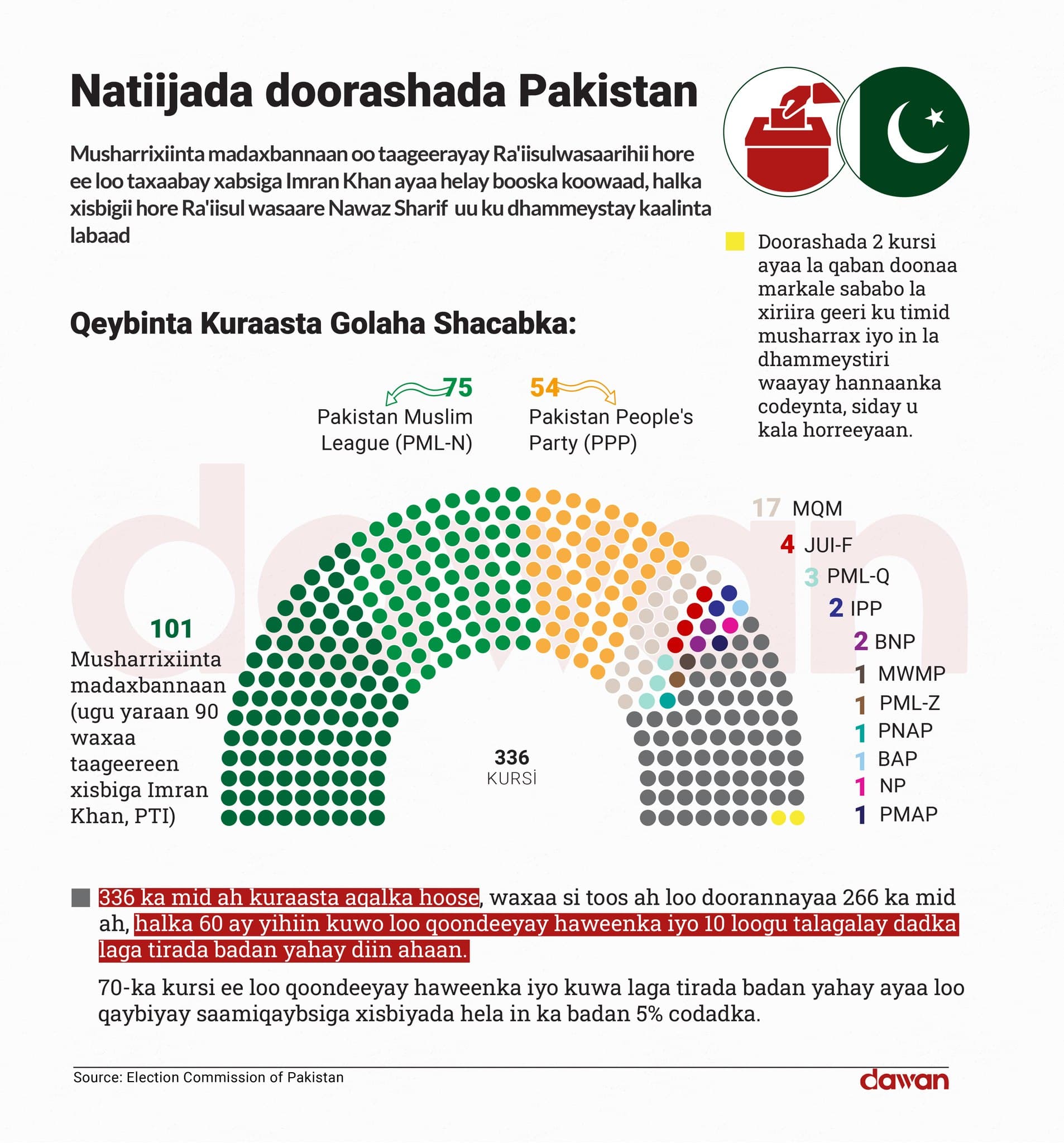 Islamabad (Dawan)- Guddiga doorashooyinka dalka Pakistan ayaa ku dhawaaqay natiijada doorashada dalkaas iyada oo musharrixiinta madax bannaan ee taageersan Ra'iisul Wasaarihii hore Cimraan Khan oo ku jira xabsiga ay ku guuleysteen kaalintaa kowaad.