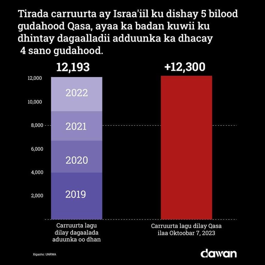 Gaza (Dawan)- Tirada carruurta ay Israa'iil ku dishay 5 bilood gudahood Marinka Gaza ayaa ka badan kuwii ku dhintay dagaalladii adduunka ka dhacay 4 sano gudahood sida lagu sheegay warbixin ay soo saartay Hay’adda Qaramada Midoobay u qaabilsan arrimaha qaxootiga ee Falastiin (UNRWA)