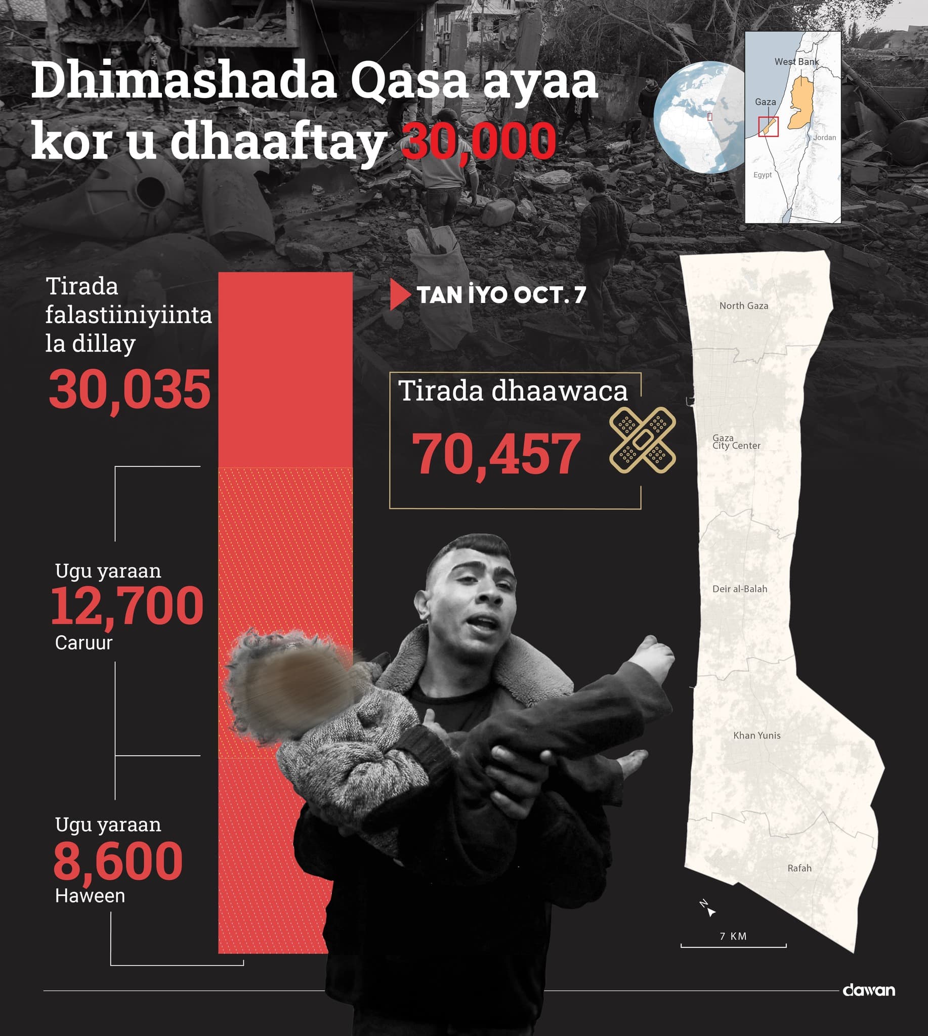 Gaza (Dawan)- Tan iyo 7-dii bishii October ee la soo dhaafay, ciidamada Israel ayaa dagaal ba’an ka waday Gaza, waxayna dileen in ka badan 30 kun oo ay ku jiraan in ka baan 12 kun oo carruur ah iyo 8,600 haween ah.