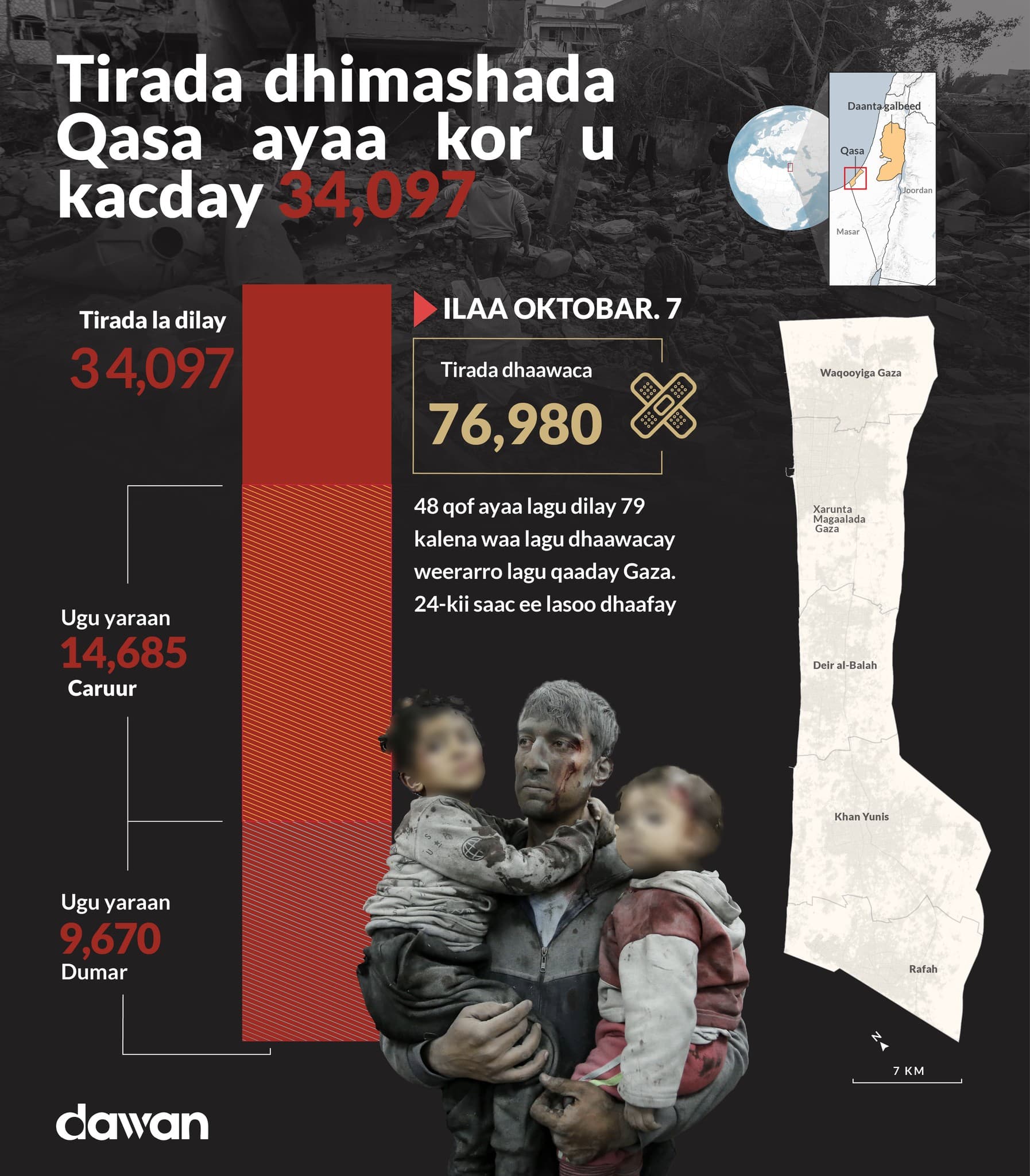 Gaza (Dawan)- Tan iyo 7-dii bishii October ee la soo dhaafay, ciidamada Israel ayaa dagaal ba’an ka waday Gaza, waxayna dileen dad gaaraya 34,097 oo ay ku jiraan 14,685 carruur ah iyo 9,670 haween ah.