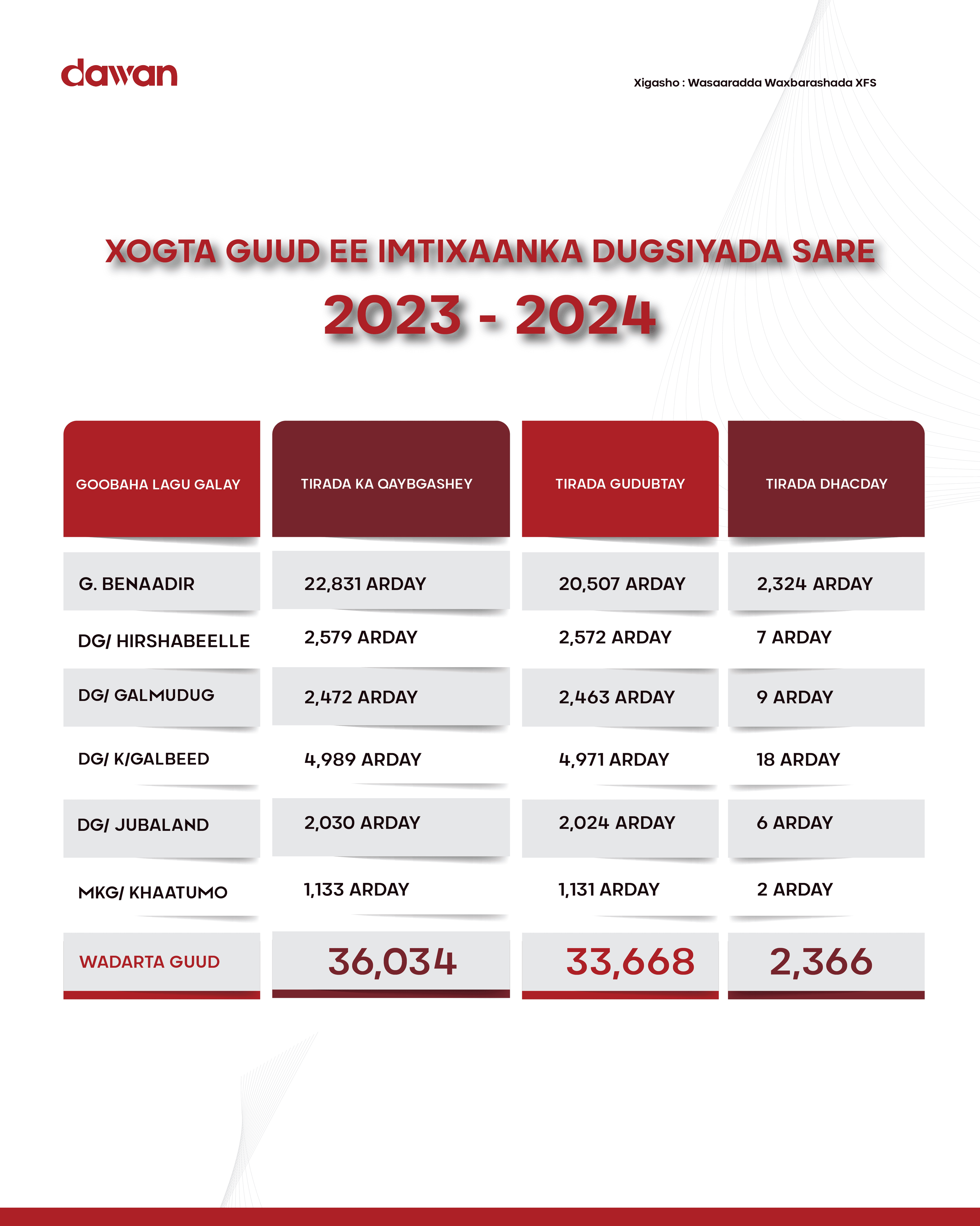 Muqdisho (Dawan)- Wasaaradda Waxbarashada Hiddaha iyo Tacliinta Sare ee Soomaaliya ayaa maanta shaacisay natiijada Imtixaanka Fasalka 12aad ee Dugsiga Sare.