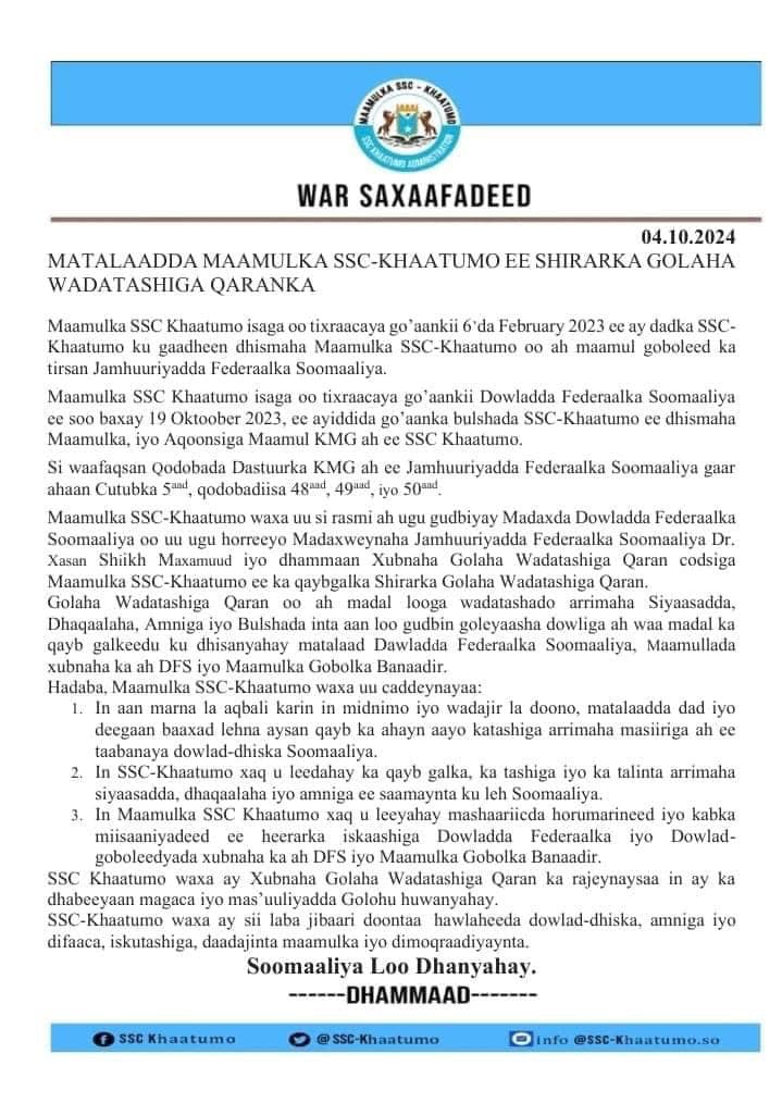 SSC-Khaatumo ayaa si cad u sheegtay saddex qodob oo kala ah: