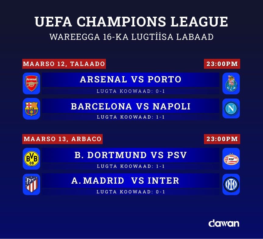 Muqdisho (Dawan)- Kulamada wareega 16-ka ee lugta labaad ee Uefa Champions league, ayaa la ciyaari doonaa caawa iyo habeen dambe.