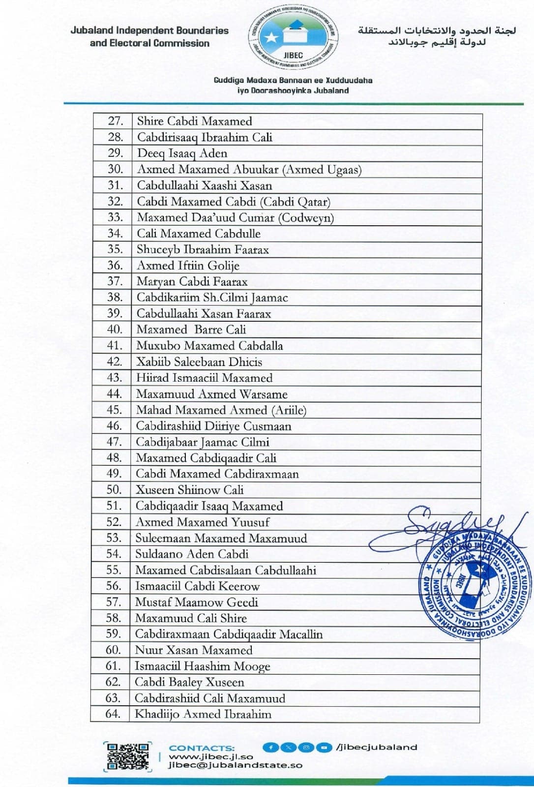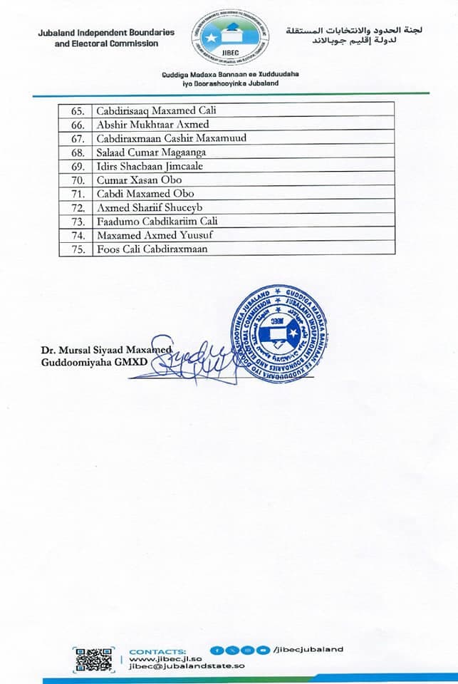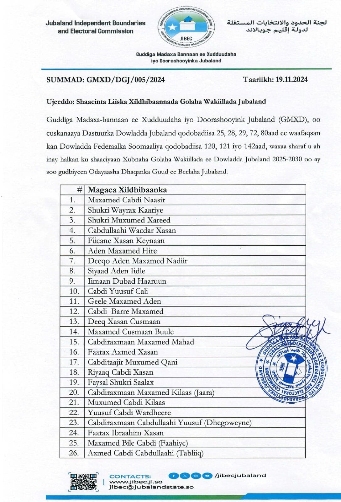 Kismaayo (Dawan)- Guddiga Madaxa Bannaan ee Xuduudaha iyo Doorashooyinka Jubaland ayaa si rasmi ah u shaaciyay liiska xubnaha cusub ee Golaha Wakiilada Jubaland, kuwaas oo tiradoodu gaareyso 75 xildhibaan. Liiskan cusub ayaa qeyb ka ah diyaarinta hanaanka doorashooyinka ee maamulka Jubaland.