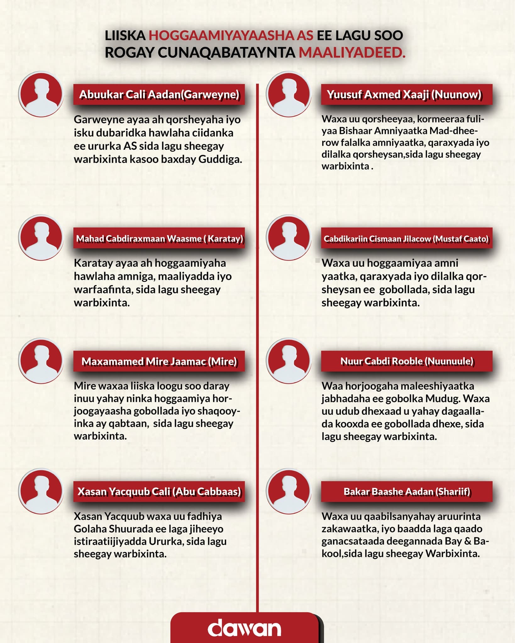 Maxamed Mire Jaamac oo ah Horjoogaha Wilaayaatka iyo Xasan Yacquub Cali Bari oo ah madaxda Golaha Shuurada ayaa liiska ku jira. Mire waxaa liiska loogu soo daray inuu yahay ninka hoggaamiya horjoogayaasha gobollada iyo shaqooyinka ay qabtaan. Xasan Yacquub-na waxa uu fadhiya Golaha Shuurada ee laga jiheeyo istiraatiijiyadda Ururka.