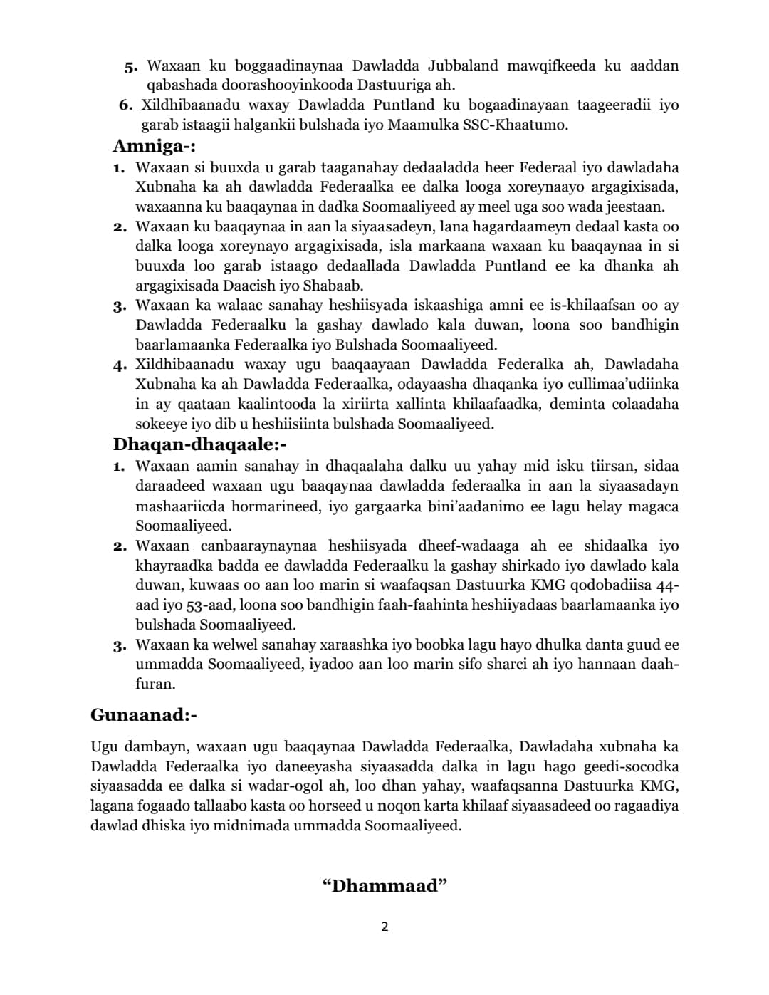 Shirka waxaa laga soo saaray qodobo la xiriira arrimaha siyaasadda, Amniga iyo Dhaqaalaha.