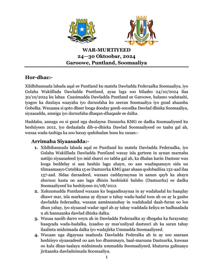 Garoowe (Dawan)- Magaalada Garoowe waxaa lagu soo gabagabeeyay wadatashigii u dhexeeyay xildhibaanada ku metela Puntland labada aqal ee Baaralamaanka Federaalka iyo Golaha Wakiilada ee Puntland kaas oo socday 24kii iyo 30kii bishaan October.