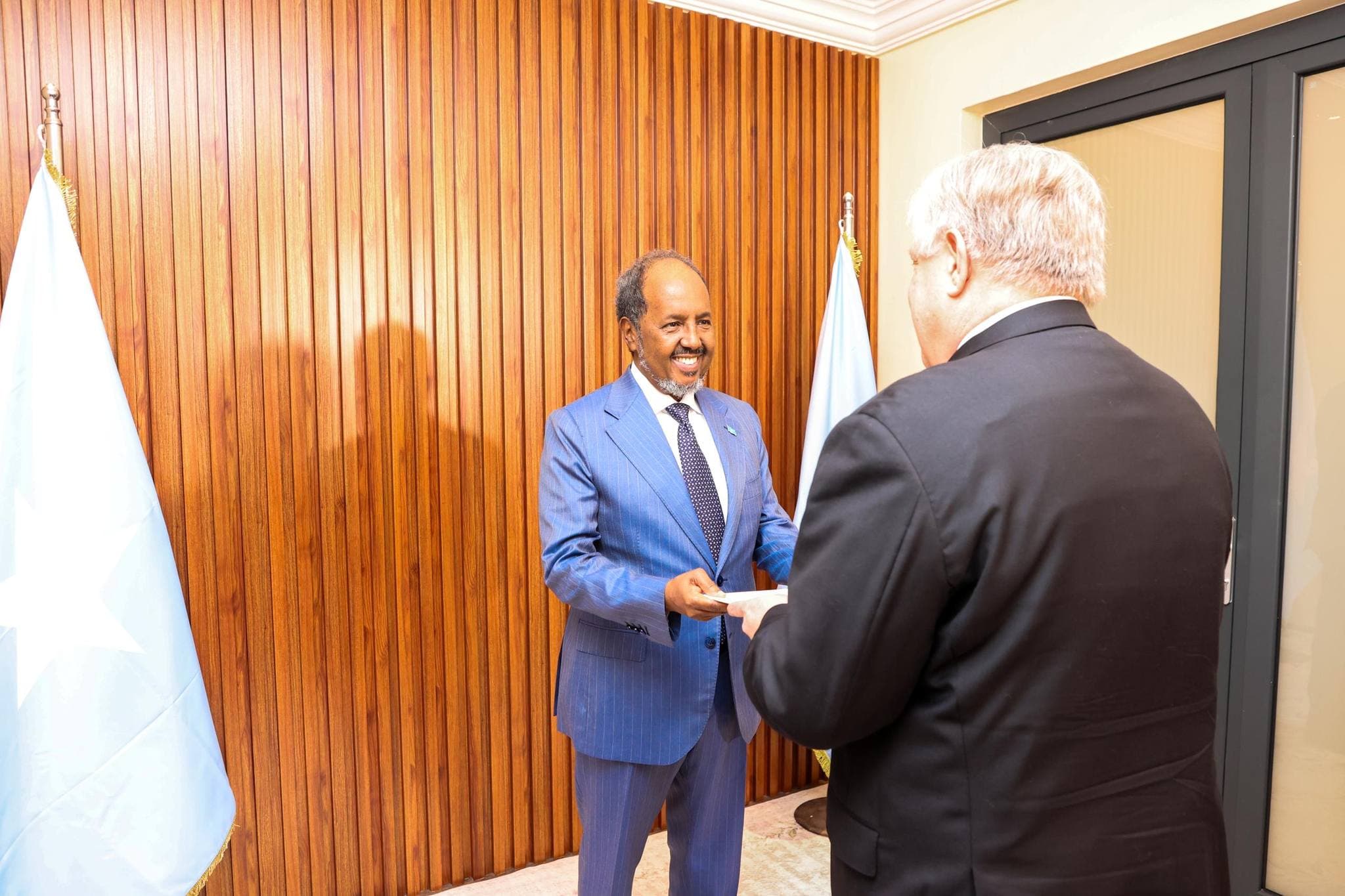 Muqdisho (Dawan)- Madaxweyne Xasan Sheekh Maxamuud ayaa warqadaha aqoonsiga danjirenimo ka guddoomay Jimcihi Safiirka cusub ee Dowladda Maraykanku u soo magacowday Soomaaliya Richard H. Riley.