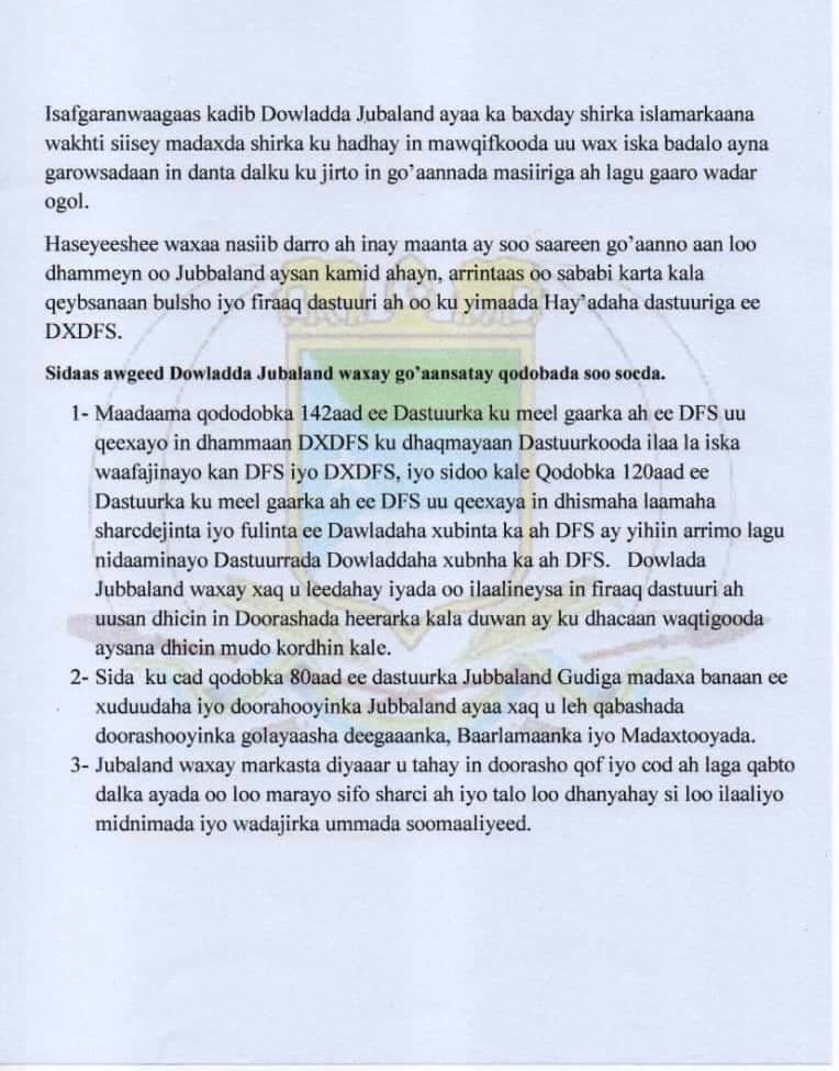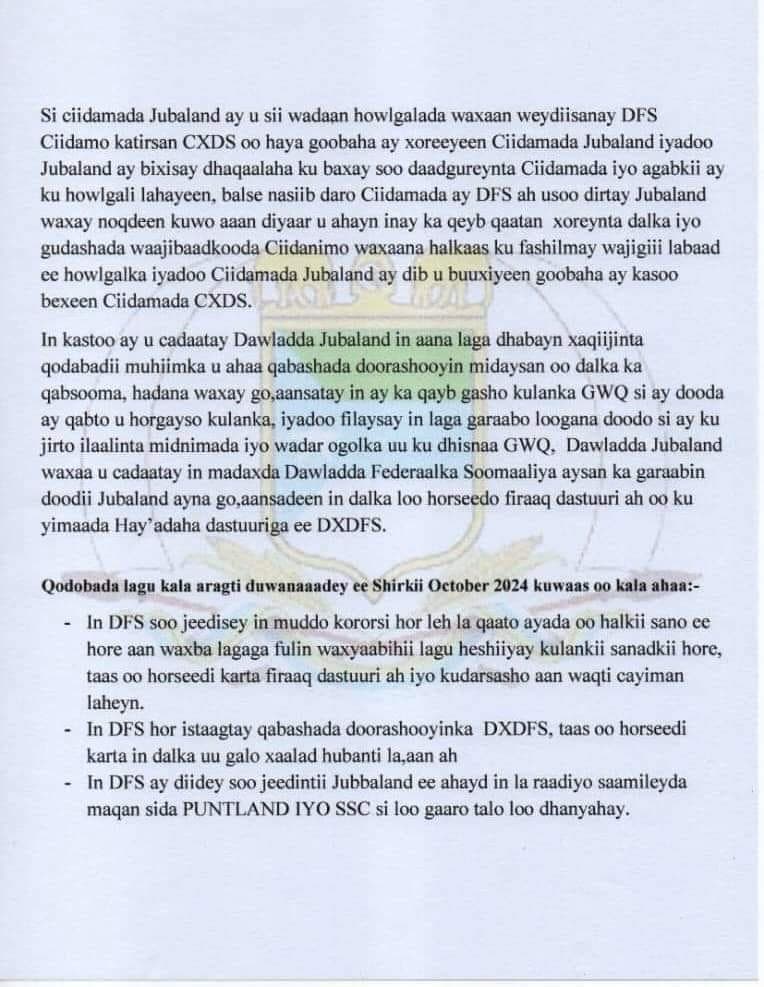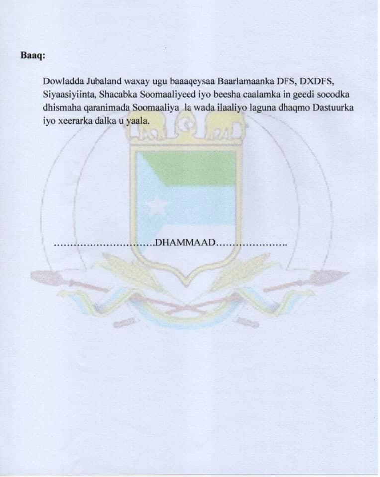 Halkaan ka aqriso war-saxaafadeed arrintan ku saabsan oo kasoo baxay Jubaland