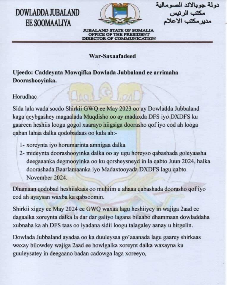 Kismaayo (Dawan)- Dowlad Goboleedka Jubaland ayaa caddeysay mowqifkeeda ku saabsan go'aanka kasoo baxay Golaha Wadatashiga Qaran ee lagu qorsheeyay in doorashooyinka dowladaha hoose iyo dowlad goboleedyada la qabto bilaha June iyo September ee 2025.