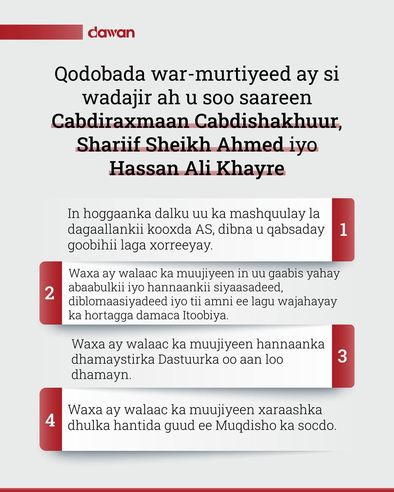 Muqdisho (Dawan)- War-murtiyeed ay si wada jir ah usoo saareen Madaxweynihii ku meel gaarka ee Soomaaliyaa, Shariif Sheekh Axmed, Ra’iisul Wasaare hore Xasan Cali Kheyre iyo Xildhibaan C/raxmaan C/shakuur ayaa eedeyn loogu soo jeediyey Madaxweyne Xasan Sheekh Maxamuud iyo xukuumaddiisa.
