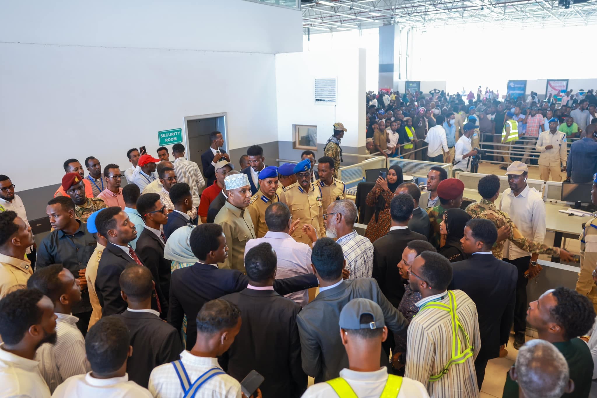 Muqdisho (Dawan)- Ra’iisul Wasaaraha Xukuumadda Soomaaliya, Xamsa Cabdi Barre ayaa booqasho ku tegay garoonka dayaaradaha Aaden Cadde ee Muqdisho, si uu u xalliyo xiisad ka taagneed labadi maalin ee lasoo dhaafay.