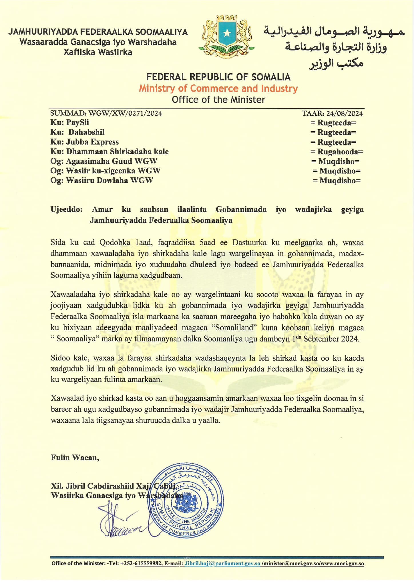 Muqdisho (Dawan)- Wasaaradda Ganacsiga iyo Warshadaha ee Soomaaliya ayaa soo saartay amar ku wajahan dhammaan shirkadaha bixiya adeegyada maaliyadeed, oo ay ku jiraan shirkadaha xawaaladaha, gaar ahaan Dahabshiil , paysii iyo Xawaalada Juba.