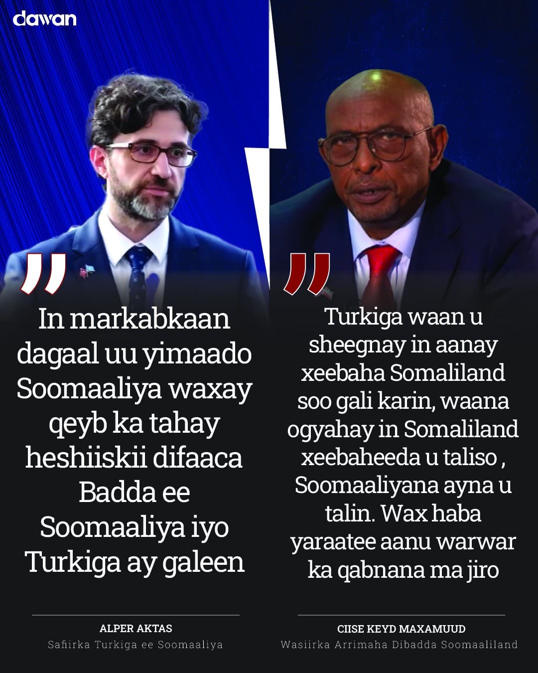 Wasiirka arrimaha dibadda Somaliland Ciise Keyd Maxamuud, ayaa yiri “ Turkiga waan u sheegnay in aanay xeebaha Somaliland soo gali karin, waana ogyahay in Somaliland xeebaheeda u taliso"