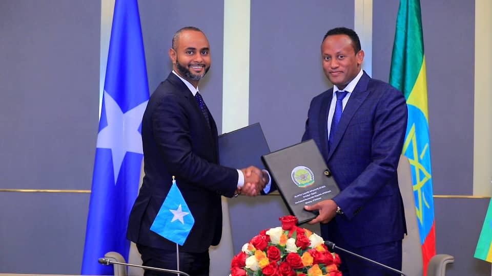 Addis Ababa (Dawan)- Wasiirka Wasaaaradda Gaashaandhigga Jamhuuriyadda Federaalka Soomaaliya mudane Cabdulqaadir Maxamed Nuur iyo dhiggiisa Jamhuuriyadda Dimuqraadiga Federaalka Itoobiya mudane Abraham Belay ayaa si loo dardargeliyo iskaashiga dhanka difaaca ee labada dal waxa ay saxiixeen cusbooneysiinta is-afgaradka difaaca kaas oo hore labada dowladood u kala saxiixdeen bishii February, 2014.