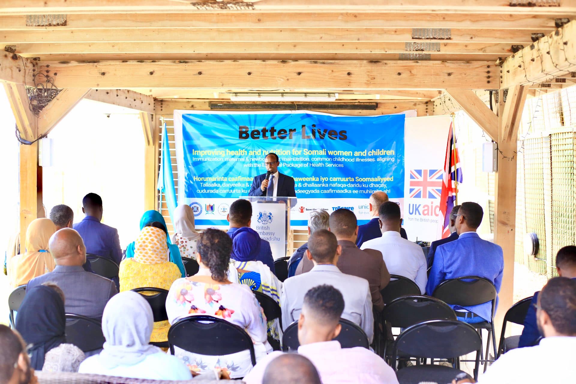 "Waxaan ku faraxsanahay inaan safaaradda UK ee Muqdisho ka furay mashruuca Better Lives oo ay maalgelisay hay’adda UKAID. Mashruucan wuxuu horumarin doonaa daryeelka caafimaadka hooyada iyo dhallaanka ee Galmudug, Jubbaland, iyo Gobolka Banaadir labada sano ee soo socota" ayuu yiri, wasiirka caafimaadka Soomaaliya Dr Cali Xaaji Aadan.