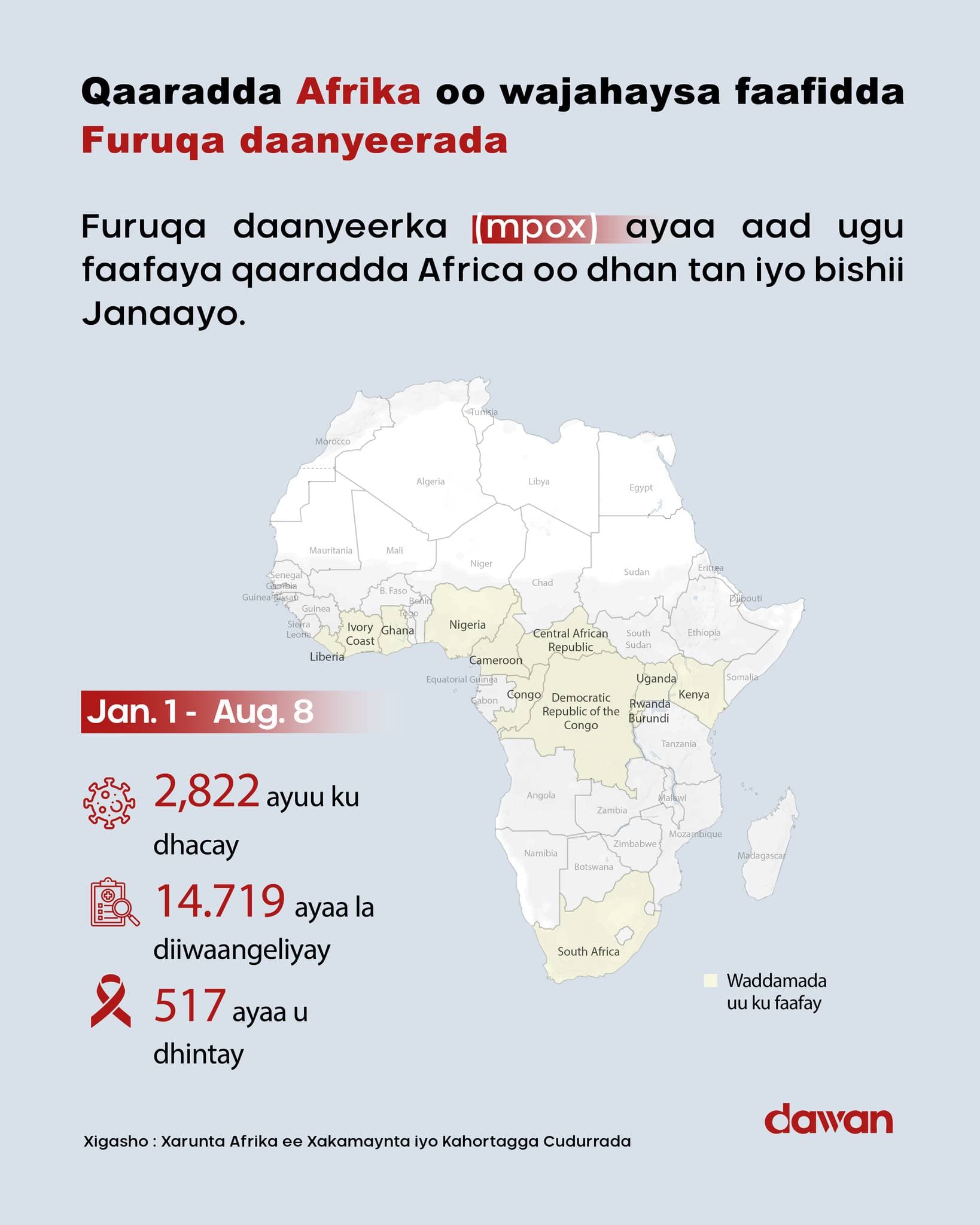 Hay'adda caafimaadka ee Midowga Afrika ayaa walaac ka muujisay cudurkan cusub ee ka dillaacay qaaradda Afrika, waxayna ku dhawaaqday xaalad degdeg ah oo caafimaad iyo in xukuumaduhu qaadaan tillaabo dheeraad oo dhanka caafimaadka la xiriira