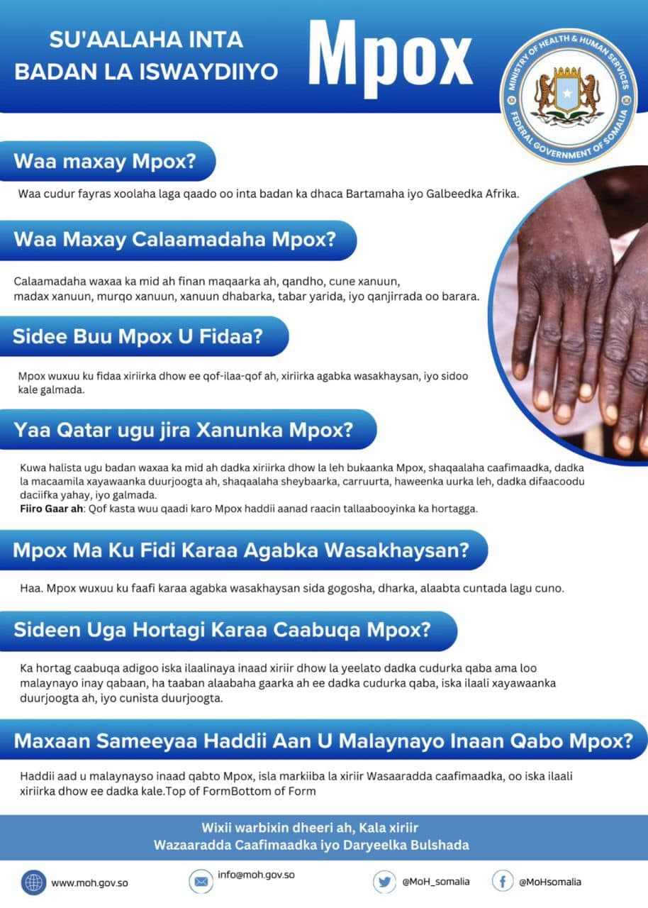 "Muwaadin Xanuunka Monkeypox (Mpox) waa cudur fayras ah oo laga qaado xoolaha inta badan waxa uu ka dhacaa Bartamaha iyo Galbeedka Afrika, hadase waxa uu u muuqdaa mid qatarihiisu sii badanayaan" ayaa lagu yiri, digniinta kasoo baxay Wasaaradda.