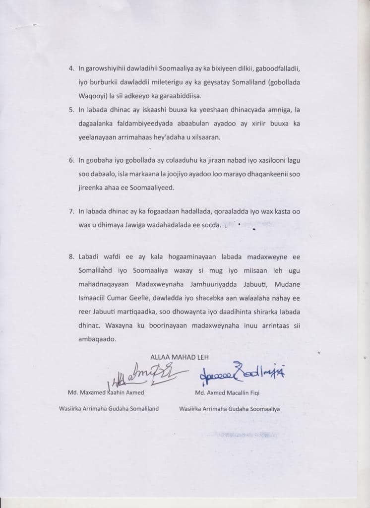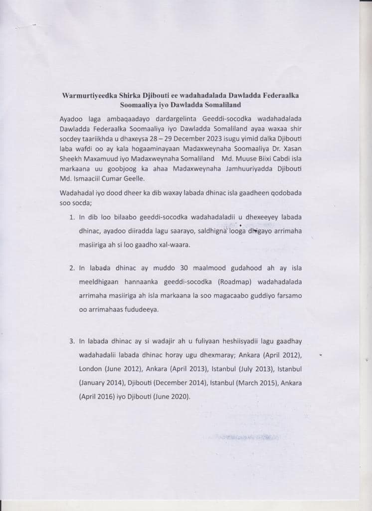 Jabuuti (Dawan)- Shirkii Jabuuti uga socday Dowladda Soomaaliya iyo Somaliland ayaa laga soo saaray warmurtiyeed ay kala saxiixdeen Wasiirada Arrimaha Gudaha ee Soomaaliya iyo Siomaliland.