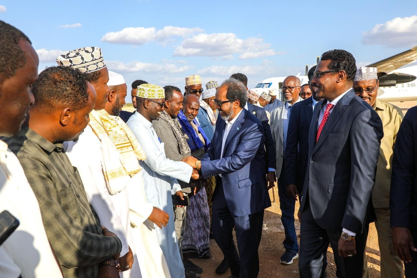 Madaxweynaha Maamul Goboleedka Galmudug, Axmed Cabdi Kaariye iyo mas'uuliyiin kale ayaa garoonka diyaaradaha Ugaas Nuur ee Caasimadda Dhuusamarreeb kusoo dhaweeyay madaxweynaha Dowladda Federaalka ee Soomaaliya Xasan Shiikh Maxamuud iyo wafdiga la socda.