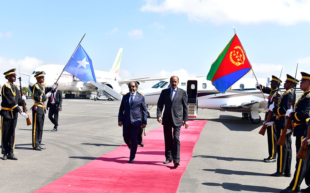 Madaxweyne Xasan Sheekh Maxamuud iyo wafdigiisa ayaa markii ay ka soo degeen garoonka diyaaradaha ee Magaalada Asmara waxaa si diiran ugu soo dhaweeyay dhiggiisa Eritrea. Isaias Afwerki.