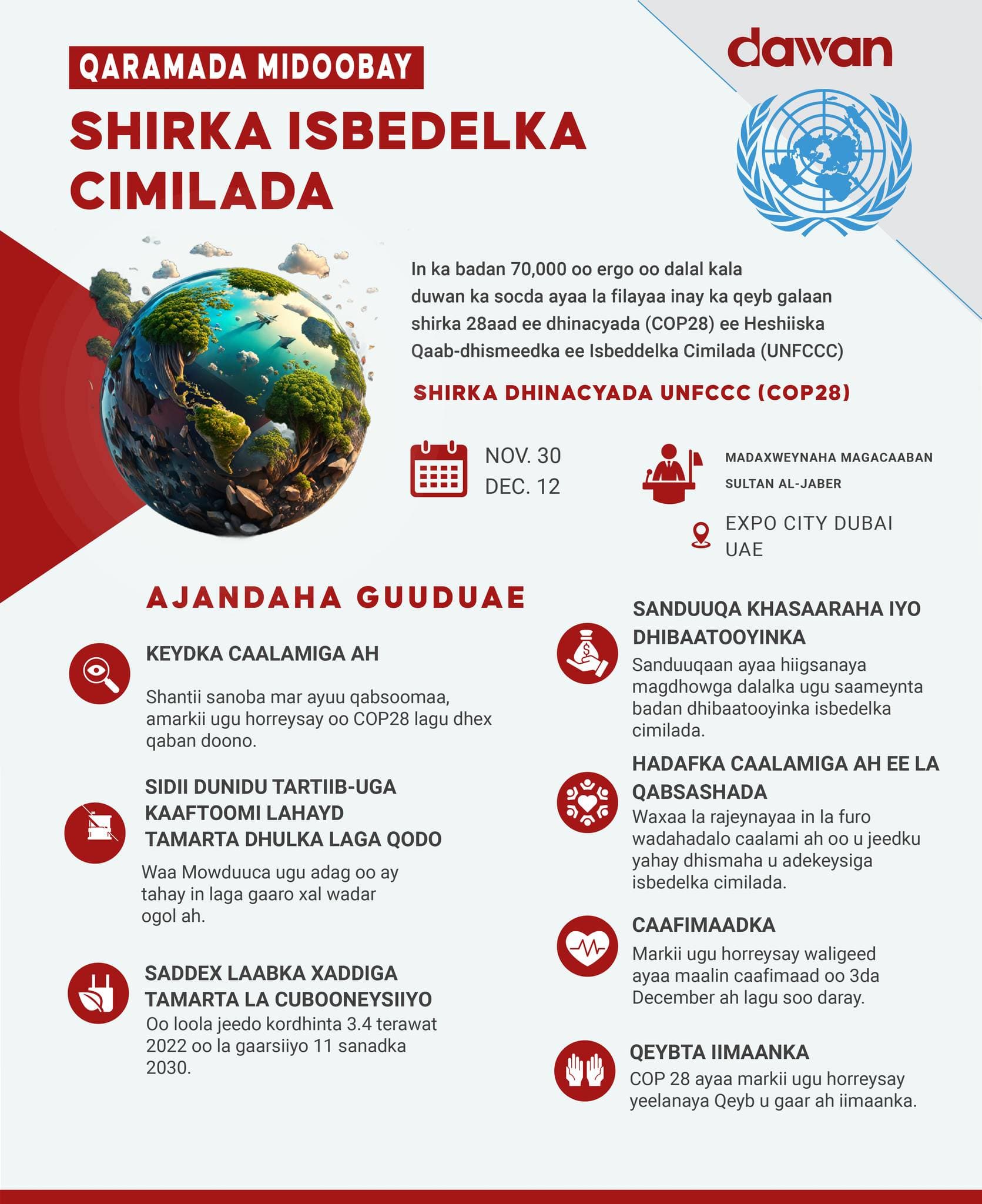 "Madaxweynaha Jamhuuriyadda ayaa Shirka kusoo bandhigi doona saameynta xooggan ee isbeddelka cimiladu ay ku yeelatay nolasha dadka Soomaaliyeed, muhiimada in la helo taageero caalami ah iyo qorsheyaasha Dowladdu ay kula taacaleyso daadadka iyo fatahaadaha ay sababatay duufaanta El Niño oo khasaare nafeed iyo hantiyeedba ay kasoo gaareen kumannaan Soomaaliyeed" . ayaa lagu yiri, qoraal kasoo baxay Villa Somalia