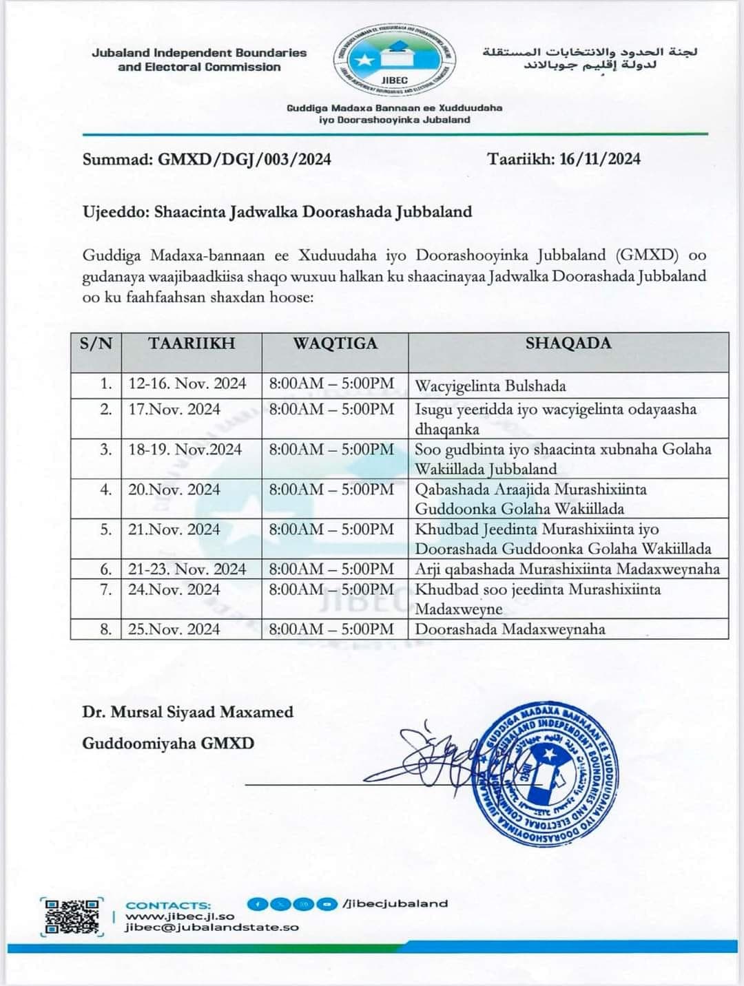 Jadwalkan wuxuu kusoo aadayaa xilli baarlamaanka Soomaaliya uu maanta meelmariyay xeerka dhisidda guddiga doorashooyinka qaranka, taas oo muujinaysa in labada dhinac ee Jubbaland iyo dowladda federaalka ay kala qaadeen laba waddo oo iska soo horjeeda. Tilaabadan waxay sidoo kale muujinaysaa kala fogaanshaha labada dhinac, iyadoo Jubaland ay noqotay dowlad-goboleedkii labaad ee xiriirka iyo wada shaqeynta u jara dowladda federaalka, kadib Puntland.